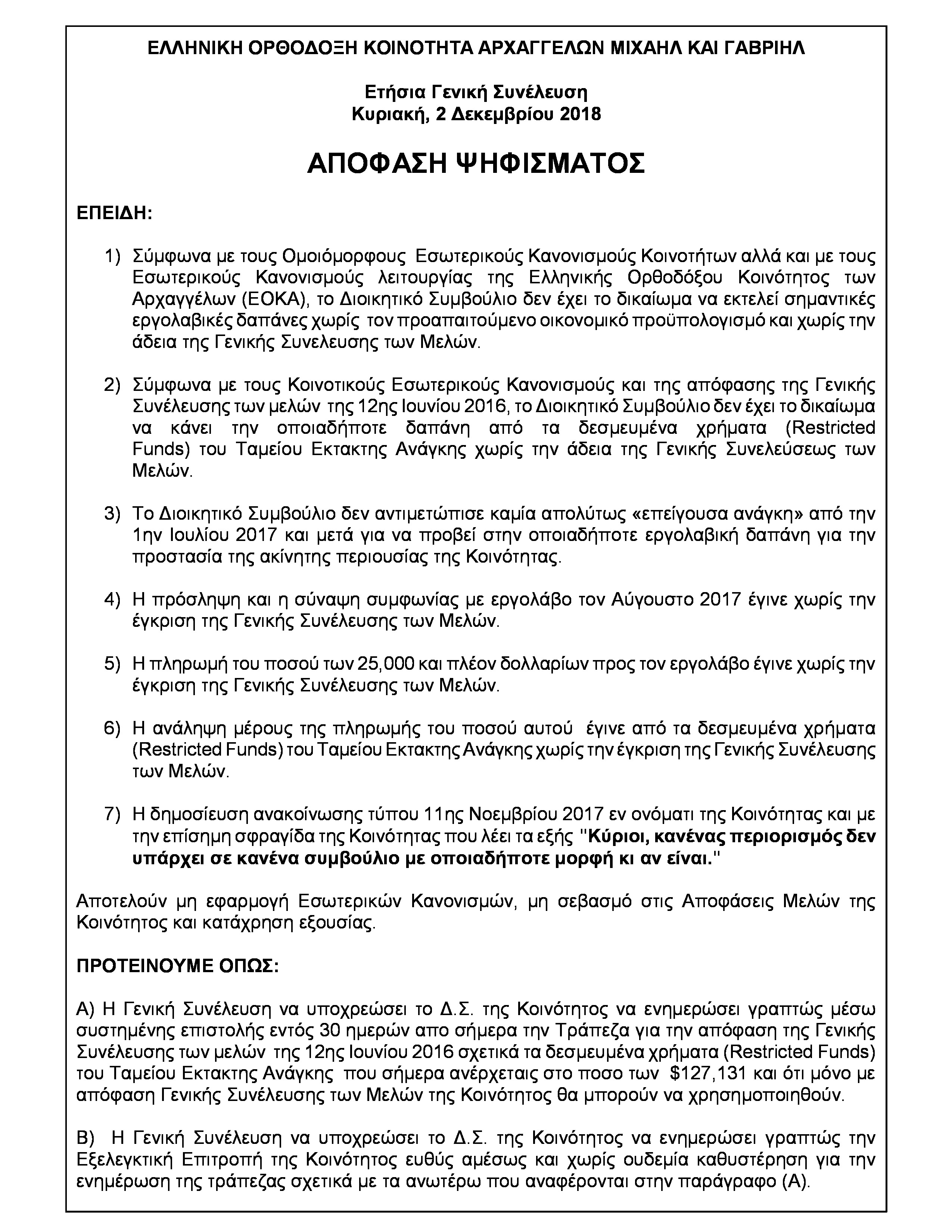 Controversial decisions by St Michael’s Community interim president Dimitrios Harakidas and his board to spend $28,000 in August 2017 to repair a small part of the parking lot without the requisite approval of members – and to withdraw restricted funds from the Contingency Fund without the requisite approval of members – were well publicized in a series of critical editorials in the local Greek-language weekly newspaper BHMA and scathing open letters from disenfranchised members of St Michael’s Community.